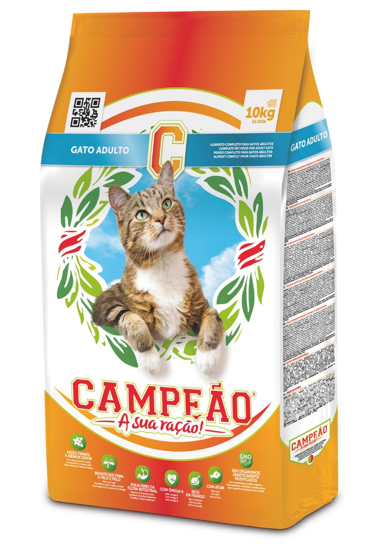 Campeão Adult Cat Food is a complete dry kibble specially developed to provide balanced nutrition for adult cats. Its formula is designed to promote overall health, support digestion, and maintain a strong, shiny coat.